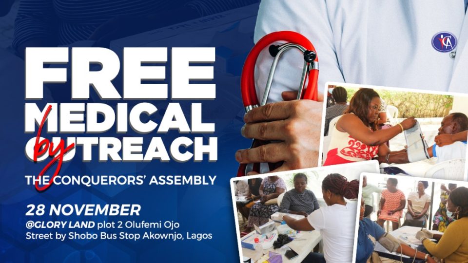 The Conquerors’ Assembly presents FREE MEDICAL OUTREACH featuring free medical check-ups, test and medication. The date is Saturday, 28 November at the church auditorium Glory Land Plot 2 Olufemi Ojo Street by Shobo Bus Stop Akowonjo. Lagos. Bring all your loved ones needing medical assistance. God Bless You