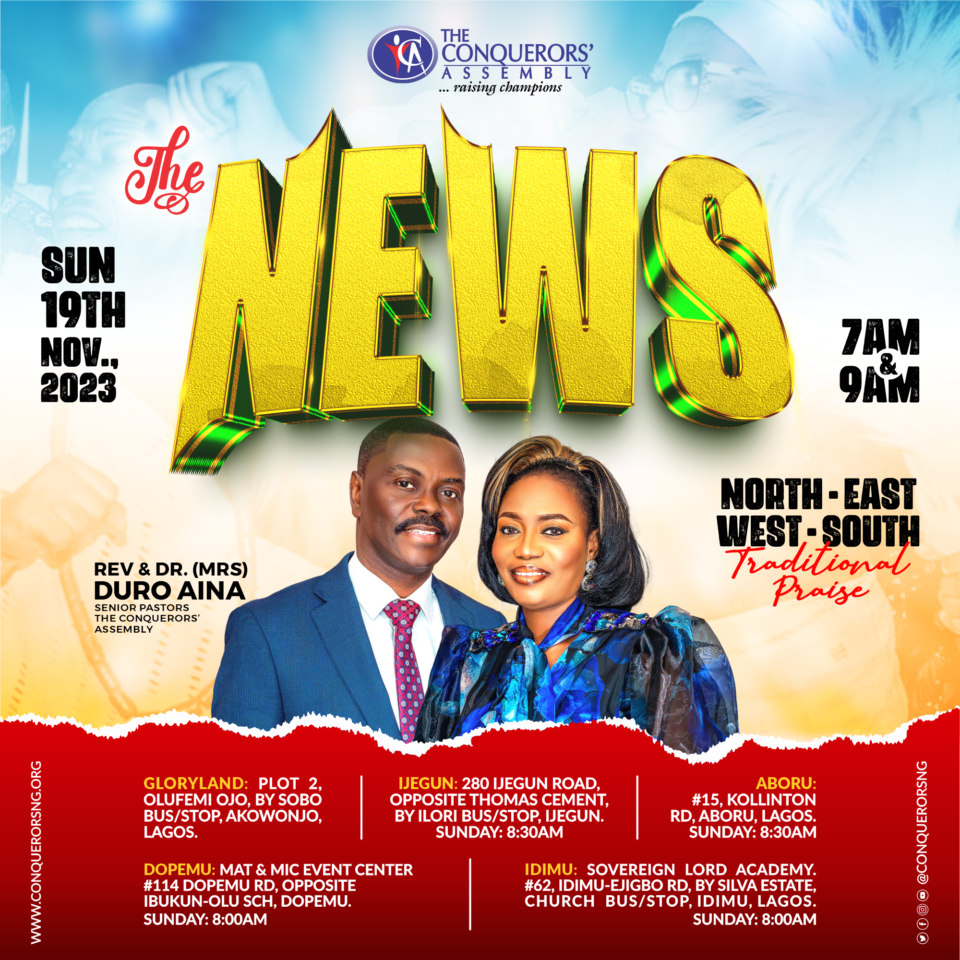 Good NEWS!!!Our annual traditional Praise event tagged, ‘THE NEWS’ (which is Praise in The NORTH, EAST, WEST and EAST regions) is here We will we be praising and worshiping God diversely from all across Nigerian culture in our traditional attires amd musical instruments. Date is Sunday 19th November 2023 by 7AM & 9AM respectively.(2 Services)…