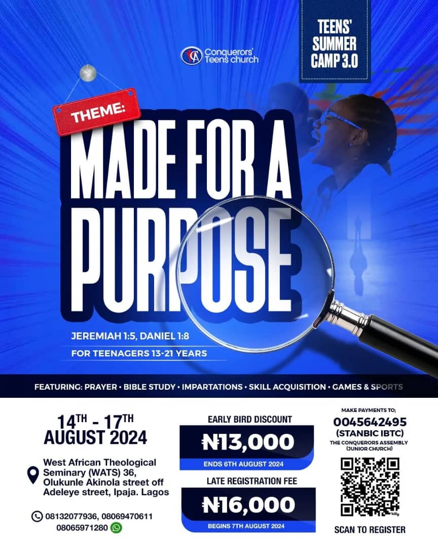 The Conquerors’ Assembly Junior church presents Teens summer camp 3.0 with the Theme, ‘Made for a Purpose.’ Jer. 1:5 and Dan. 1:8 This year’s edition would feature Bible study classes, Group study, Impartations, Skill Acquisition, Games and Sports. The camp begins by wed. 14th to Sat. 17th August, 2023 at The west African Theological Seminary(WATS),…