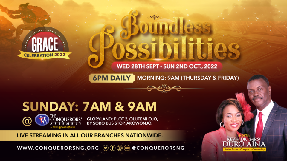 Hallelujah!!!Get set for ‘Boundless Possibilities’ at Grace Celebration 2022. Date: Wednesday, September 28 to Sunday, October 2nd, 2022. It Shall be an extraordinary season of Breakthrough, Miracles, Healing, Jubilation, and Outstanding Testimonies. We shall also be streaming live to all our social media pages, YouTube, Facebook, Twitter and Instagram @conquerorsng; and on this website. Do…