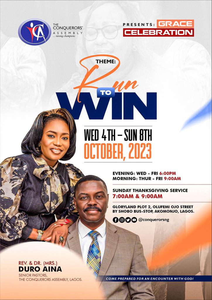 The annual gathering of the Conquerors Worldwide, tagged ‘Grace Celebration’ is here. It is not just a conventional convention, but a gathering where diverse miracles and testimonies happens. The theme of this year’s convention is ‘Run to Win’ and it shall hold at The Conquerors’ Assembly, (Gloryland), Plot 2, Olufemi Ojo Street, Akowonjo, Lagos between…